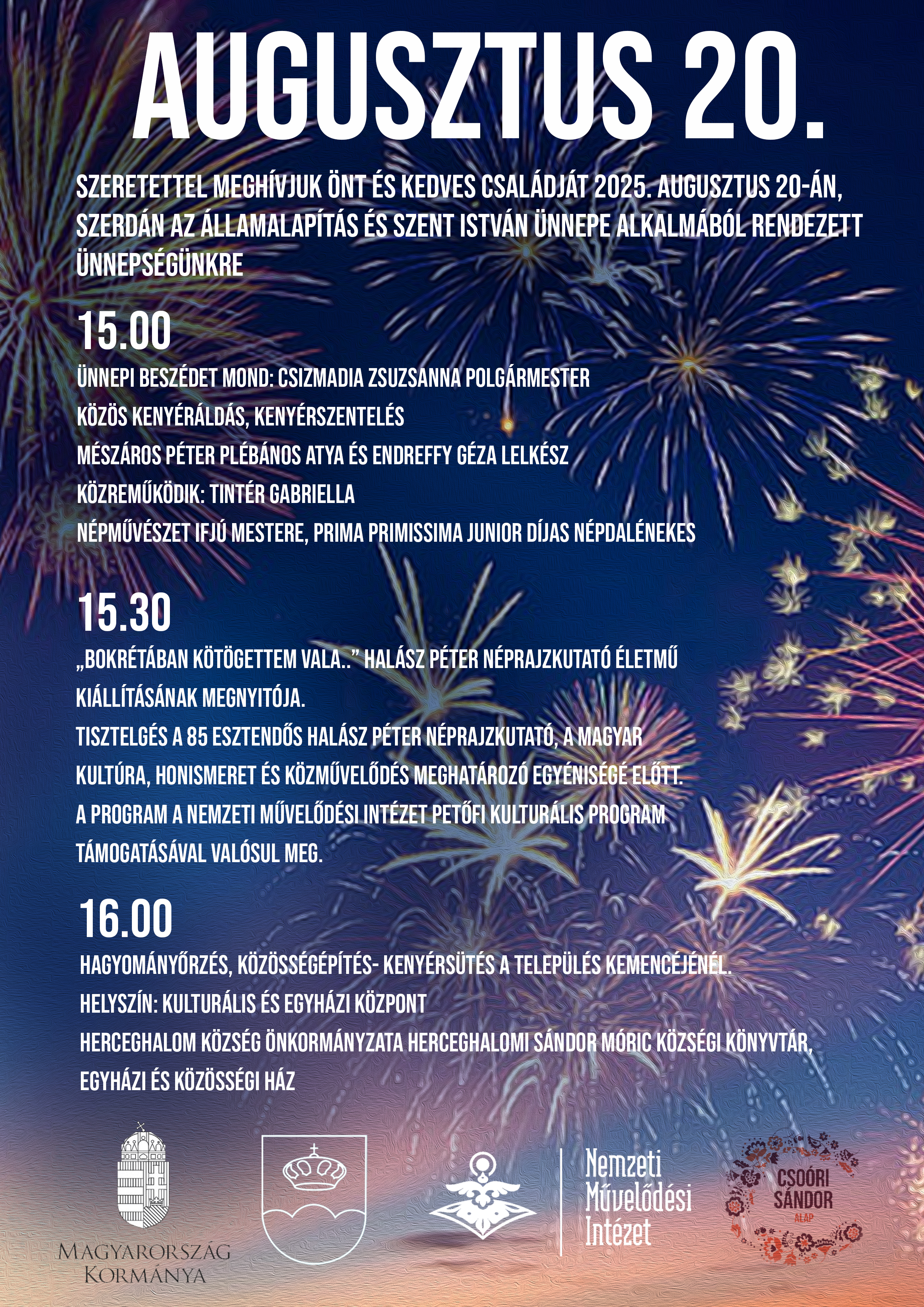 Szeretettel meghívjuk Önt és kedves családját 2025. augusztus 20-án szerdán az Államalapítás és Szent István ünnepe alkalmából rendezett ünnepségünkre